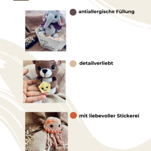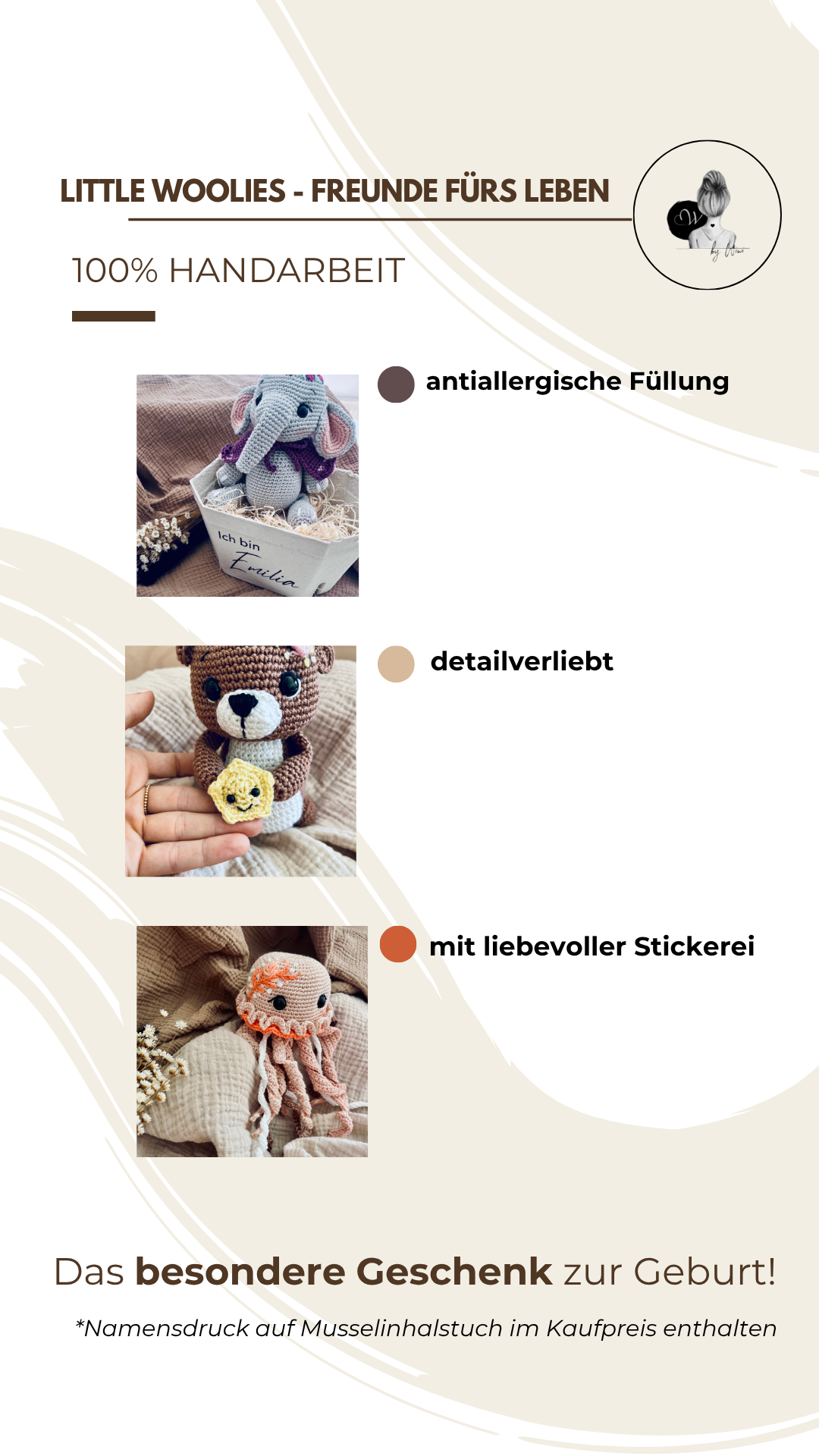 Unsere liebevoll gehäkelten Little Woolies sind einzigartige Begleiter fürs Leben. Jedes Tier wird zu 100% von Hand gefertigt und mit viel Liebe zum Detail gestaltet – von der feinen Stickerei bis hin zur hochwertigen, antiallergischen Füllung.