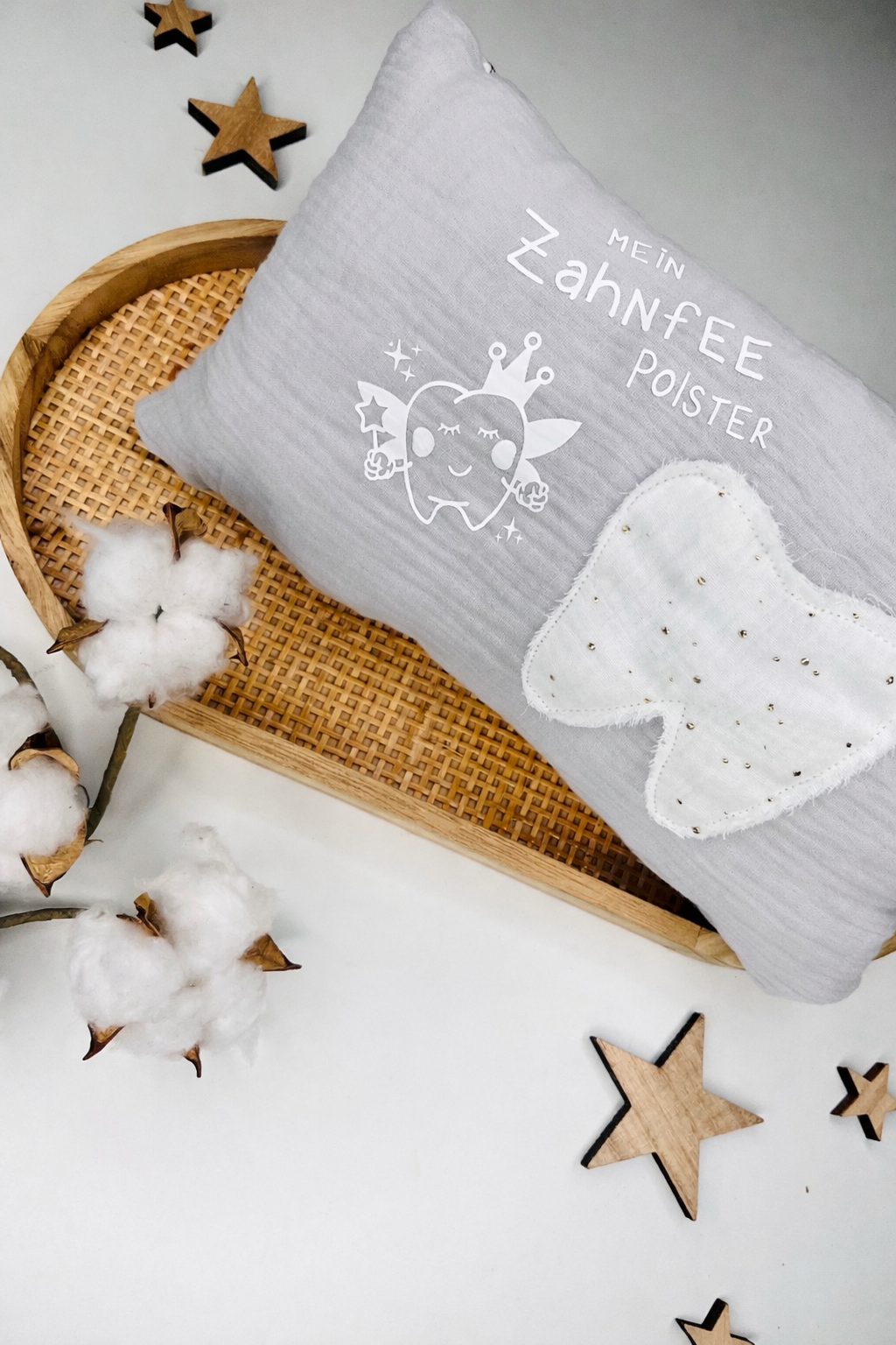 Legt den kleinen Milchzahn am Abend in die kleine “Zahntasche” des Polsters.